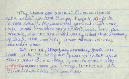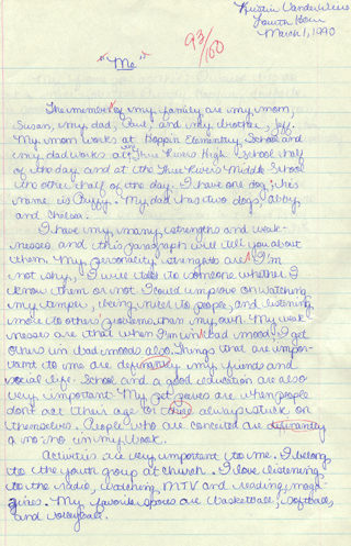 Regardless of how many things have changed or stayed the same in that paper, what I learned from it was most important. Back then, I may not have realized it, but I was recognizing the strengths and weaknesses that I had. Without even knowing it, I may have changed that day by what I put down on that paper. Even if I didn’t change that day, I have changed since, and writing has allowed me to do that. I think that writing puts me in touch with myself, helps me to sort out my thoughts, and makes the fuzzy picture in my life seem a little clearer. At the end of my paper, I put that I was an okay person, but there was definitely room for some change. Today, I still feel as though there is room for change. Without writing, I may not realize this. I may not be sitting here saying that there is a person who wants to, and strives to be a better person. That is what I have learned from this paper, if not back then, but today as I read it again.