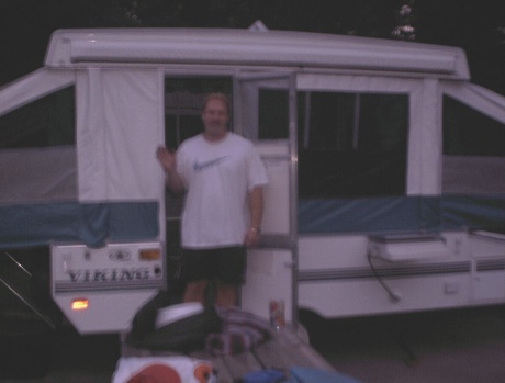 Scott at our camper! (This pic did not turn out very well:-() |