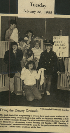 All through elementary school, I was involved in the Apple Crate Kids, a drama club where we traveled to various places and performed plays. This picture was from the play, "Dewey Decimal System." (I'm in the front with the hankie!) |