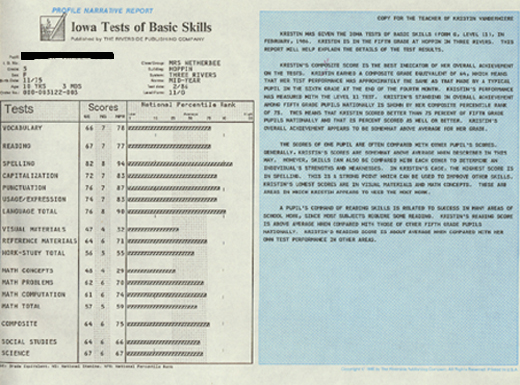 These are the original results from my Iowa Test of Basic Skills, taken in fifth grade. As you can see, my strong points are in language and reading skills, and low points are in math. I never did like math! |